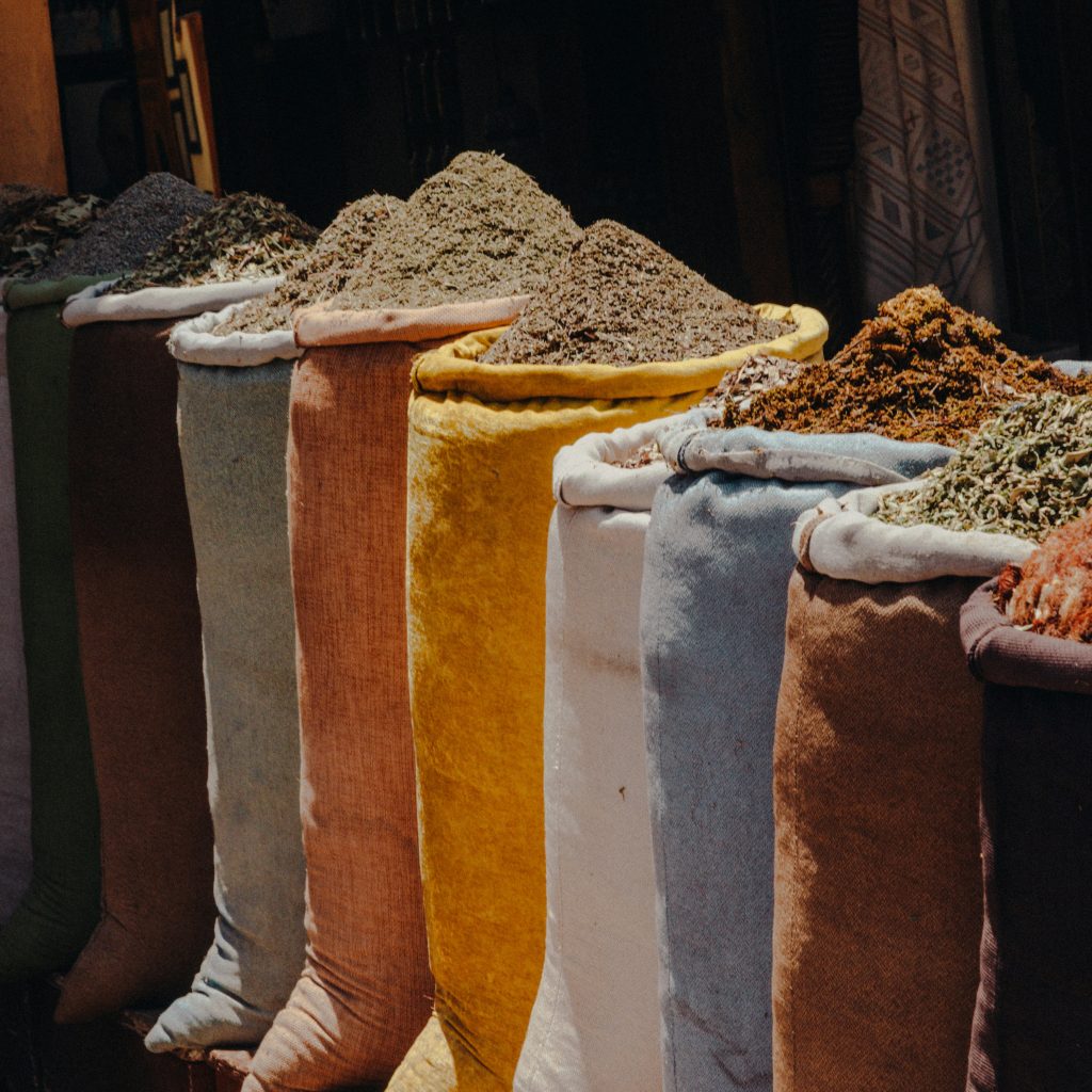 En Marrakech, el zoco de especias se despliega cerca de la Plaza Jemaa el-Fna. Aquí se venden montañas perfectamente ordenadas de comino, cúrcuma, jengibre, pimentón dulce y picante, además de mezclas listas para tajines y cuscús. Los comerciantes conocen el origen exacto de cada producto: qué valle produce el mejor azafrán, qué región ofrece semillas más frescas o qué molienda conviene para cada receta.