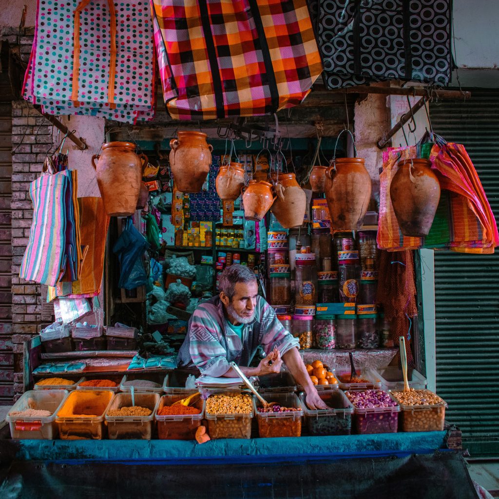 En Fez, el conocimiento del vendedor es central. Las especias se recomiendan según el plato, la estación del año y el tiempo de cocción. El intercambio es directo y detallado, pensado para quienes cocinan con atención.