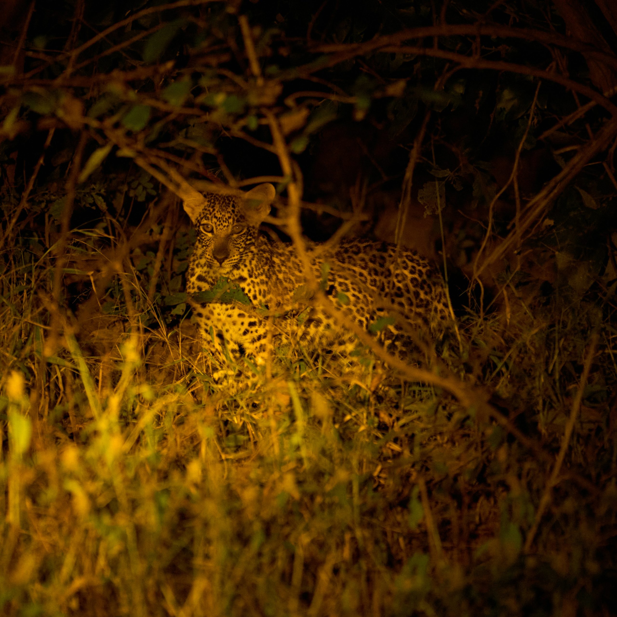 Al caer la noche, los grandes felinos despiertan de su letargo diurno. Los leopardos acechan desde las ramas bajas de los árboles o avanzan con pasos sigilosos entre la hierba alta, mientras las leonas se organizan para la caza. A diferencia de las horas de luz, cuando suelen reposar bajo la sombra, en la penumbra muestran su carácter activo y estratégico. También es posible avistar hienas, zorros orejudos y civetas, criaturas discretas que se revelan únicamente bajo el amparo de la oscuridad.